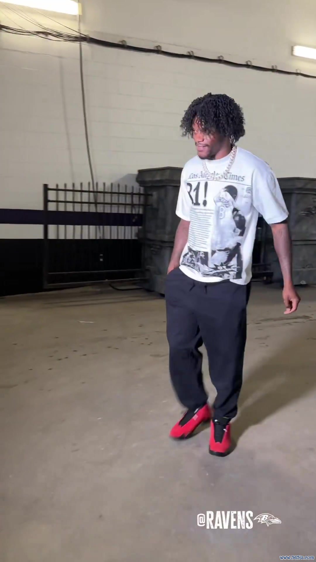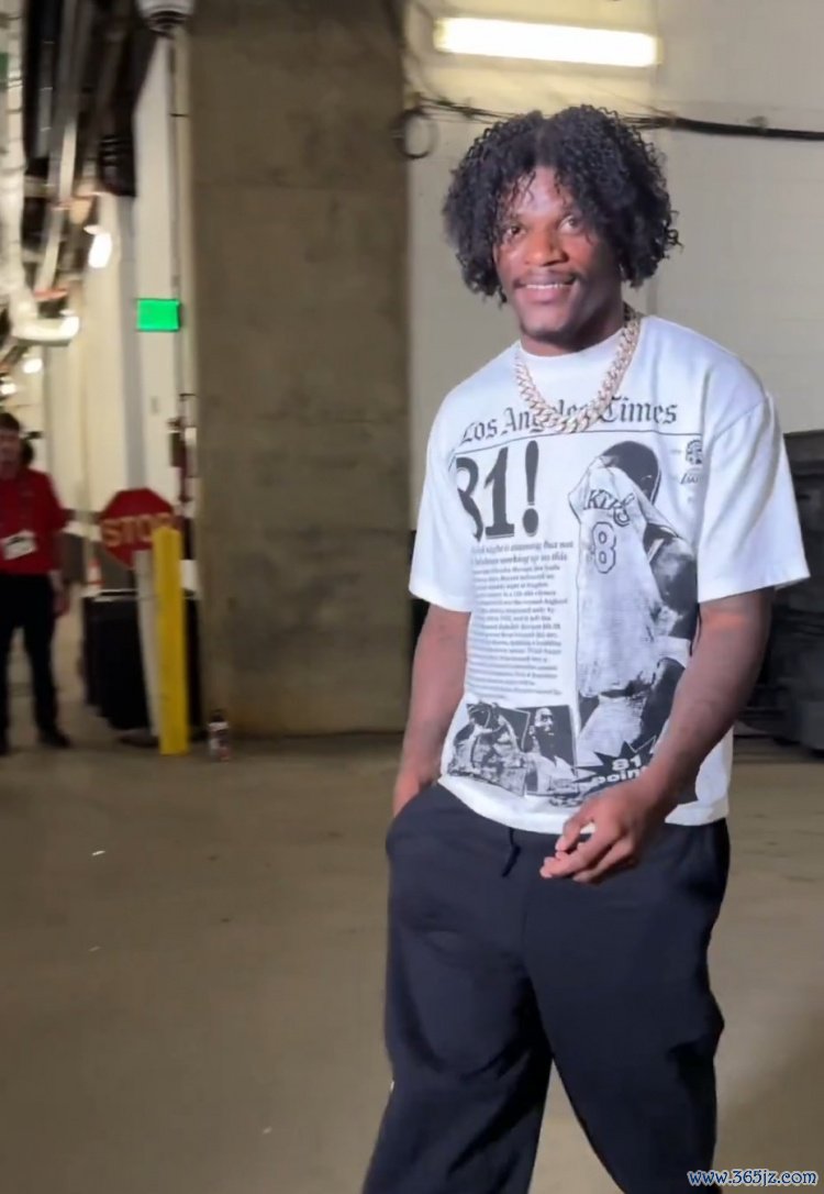 9月23日讯 在今天,巴尔的摩乌鸦队主场作战 对阵底特律雄狮队的NFL赛事 赛前, 游泳快讯体育直播乌鸦队明星四分卫拉马尔-杰克逊穿着一件科比的T恤来到运动活动 场 。