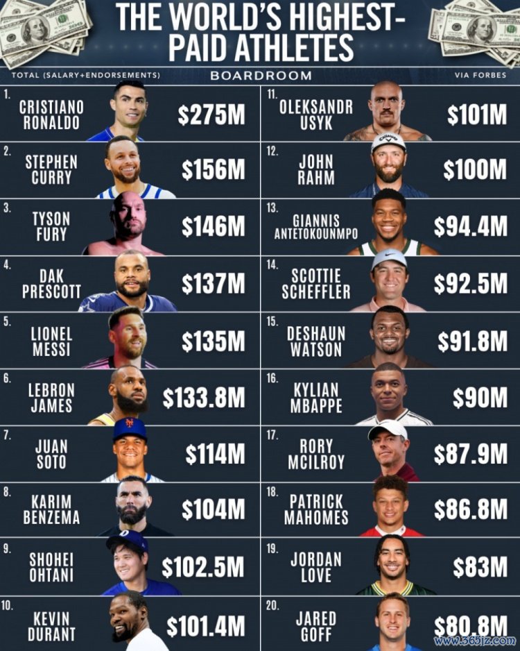 10月6日讯 今天,美媒BoardRoom转载了世界范围内收入(工资+代言)最高的运动活动 员排名,这份榜单最早发布于今年5月。