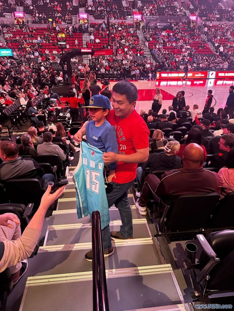 CBA元素!一位球迷拿着杨瀚森青岛队运动活动 服 观战开拓者vs勇士