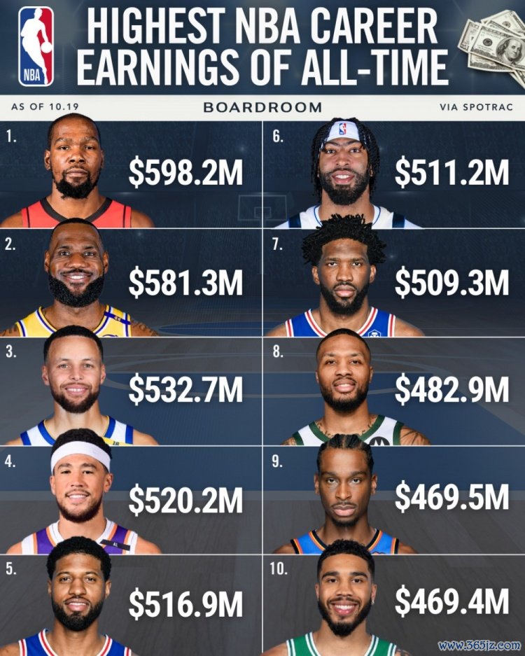 意甲英超直播列出了NBA历史上总薪资最高的十位球员。刚刚签下续约合同的杜兰特以5.982亿美元排在第一。