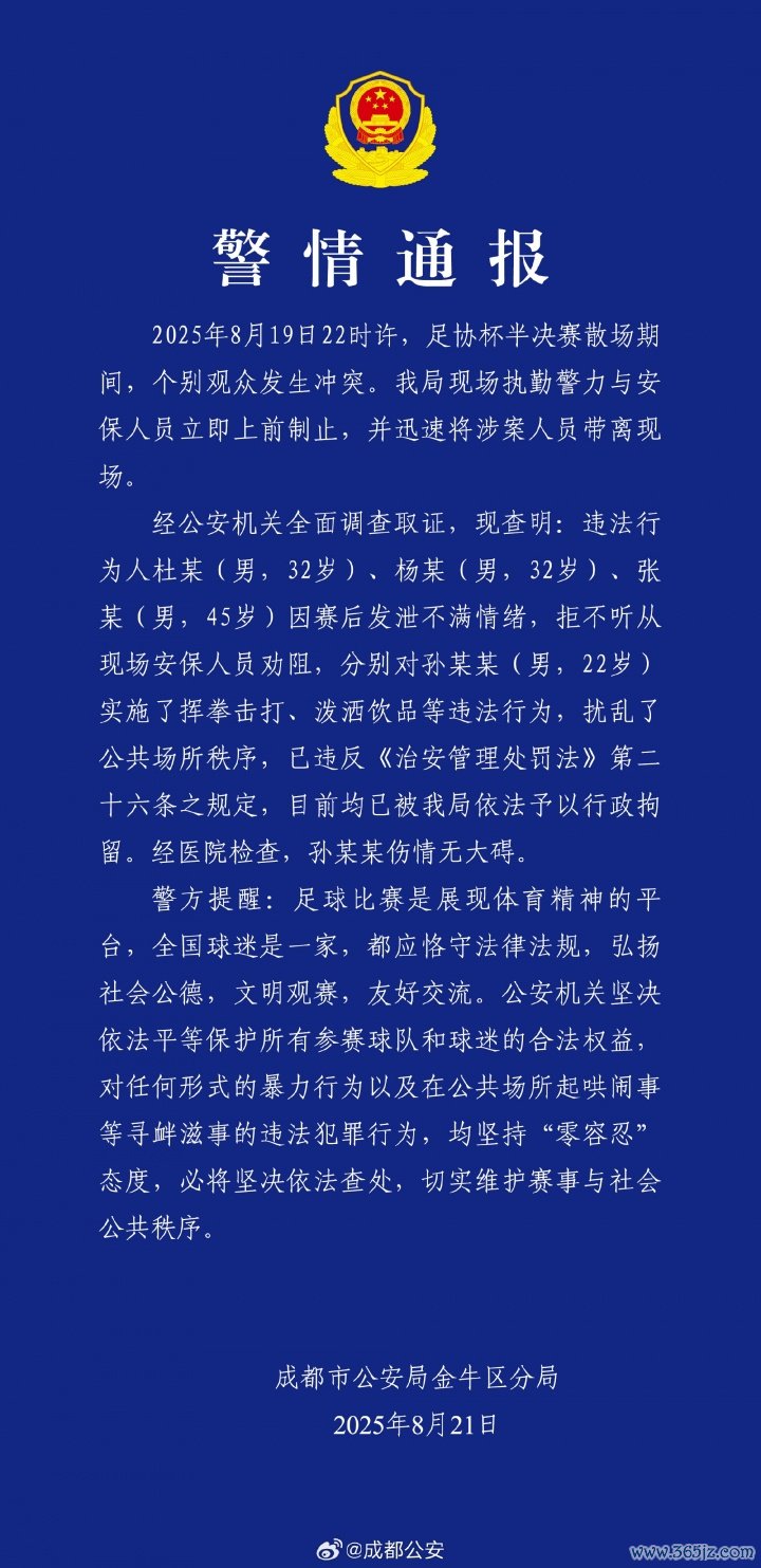 08月21日讯 2025年8月21日,成都市公安局金牛区分局发布警情通报,足协杯准总决赛 后滋事三人被行拘。
