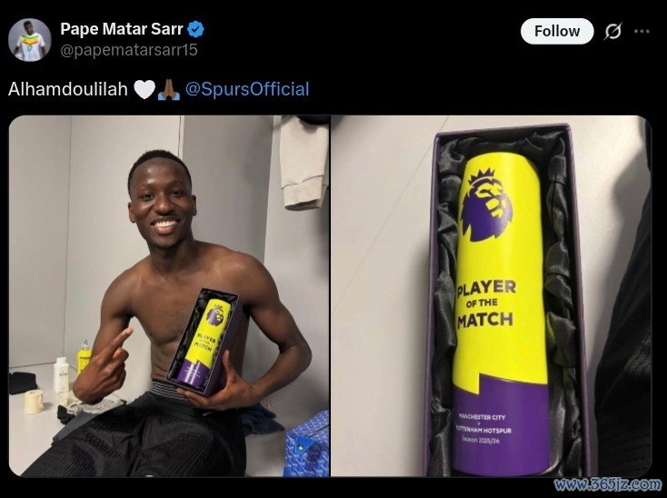 本场赛事 热刺球员萨尔表现不俗,搏击资讯赛后他也当选英超官方评选出的本场最佳球员。球员赛后也在个人社媒晒出与奖杯的合照。