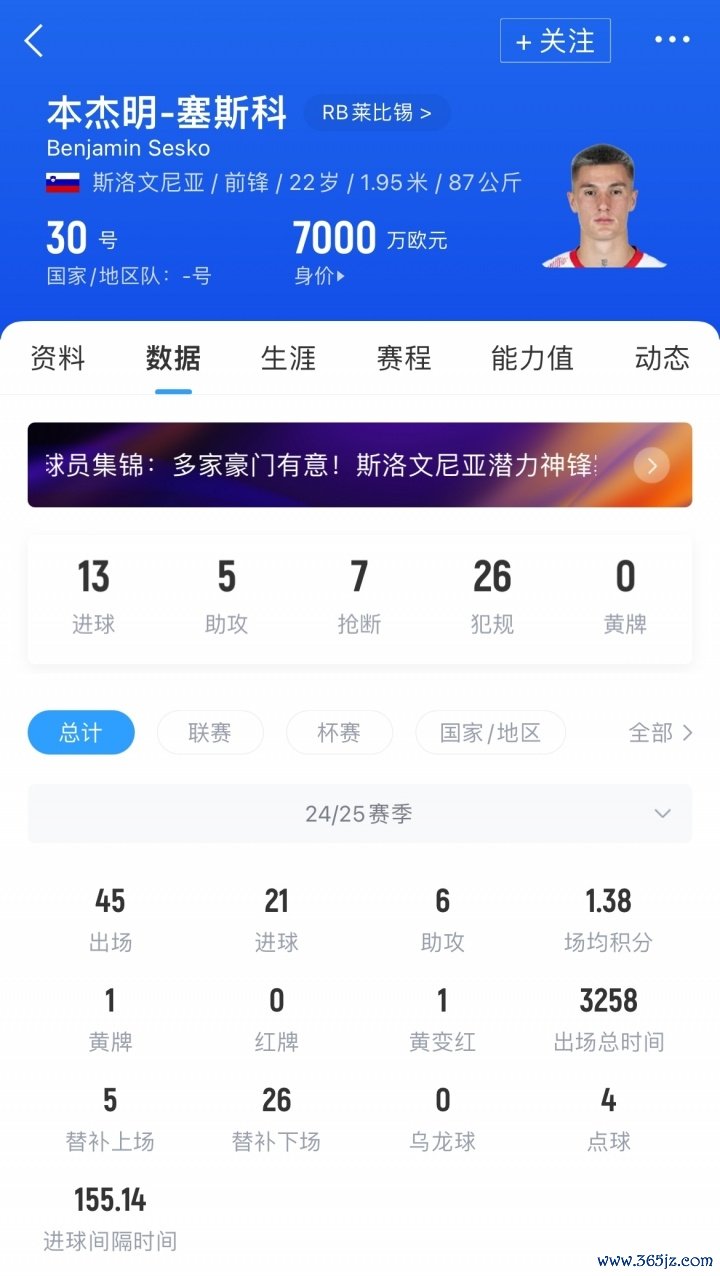 塞斯科现年22岁,上赛季为莱比锡出场45次,取得21粒得分 和6次助功 ,他与莱比锡现有的合同2029年到期,目前球员德转估值7000万欧。