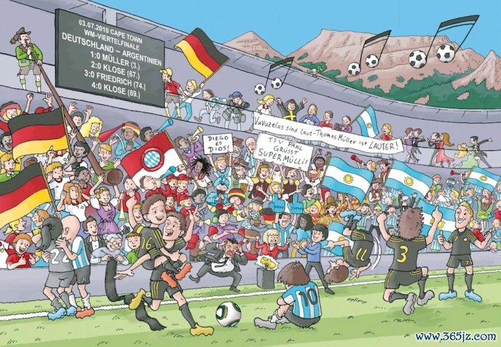 以一张图片为例,穆勒选择了2010年南非世界杯赛 战胜阿根廷的赛事 。画面中,梅西坐在庆祝获胜 的德国队员们之中,背景里还有金靴奖杯——穆勒在那届赛事中打进五粒得分 ,与弗兰、斯内德和比利亚并列成为赛事最佳射手。