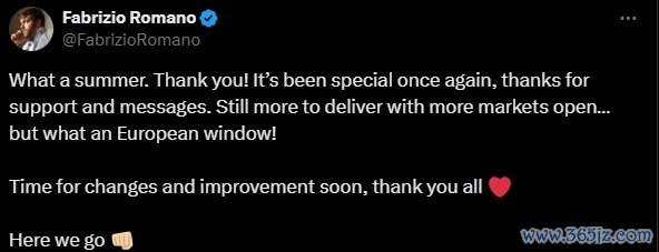 09月02日讯 今天凌晨,欧洲五大职业联赛 夏季转会窗正式关闭,名记罗马诺发文感谢球迷。