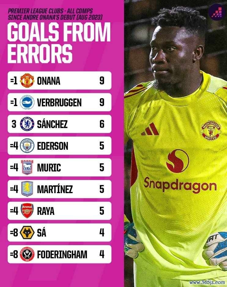 9月9日讯 曼联守门员奥纳纳离队在即,OPTA也盘点了自奥纳纳2023年8月加盟曼联以来,搏击资讯体育直播英超所有守门员在各项赛事出现错误 导致失球数, 游泳快讯奥纳纳并列最多。具体如下: