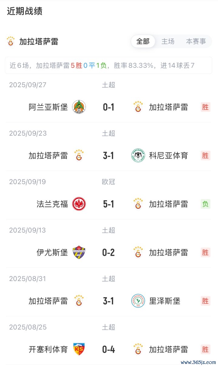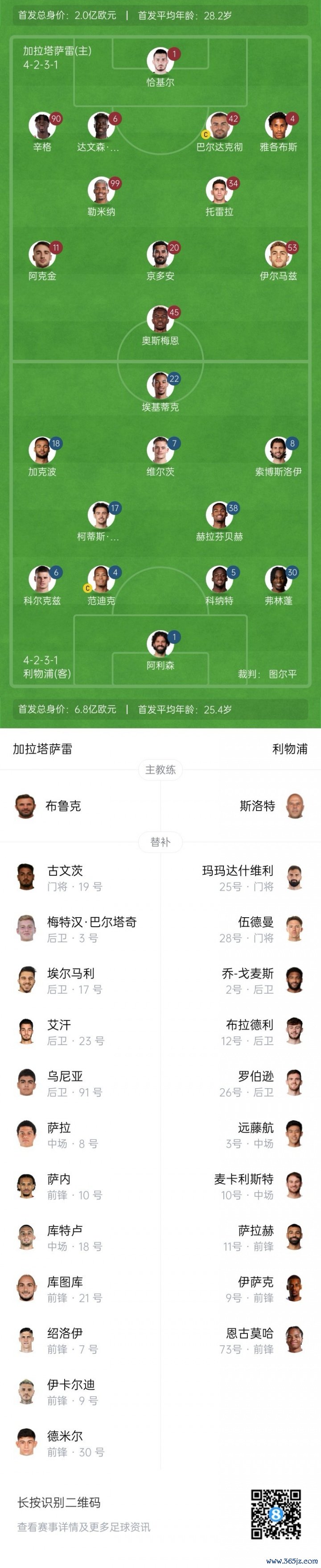加拉塔萨雷杆位:1-恰基尔、90-辛格、6-达文森·桑切斯、42-巴尔达什彻、4-伊斯梅尔-雅各布斯、34-托雷拉、99-勒米纳、11-阿克金、20-京多安、53-伊尔马兹、45-奥斯梅恩