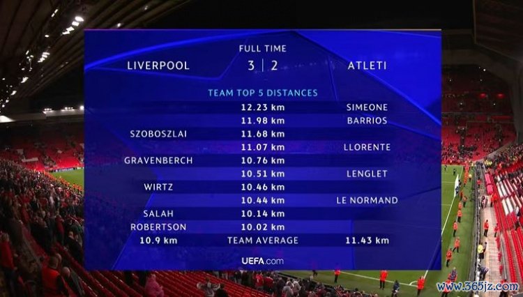 利物浦vs马竞移动距离 :小西蒙尼12.23km最多,红军队内索博居首