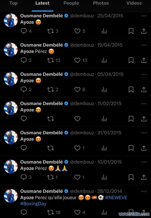 这些推文显示,现效力于比利亚雷亚尔的阿约泽-佩雷斯曾是登贝莱的偶像之一。