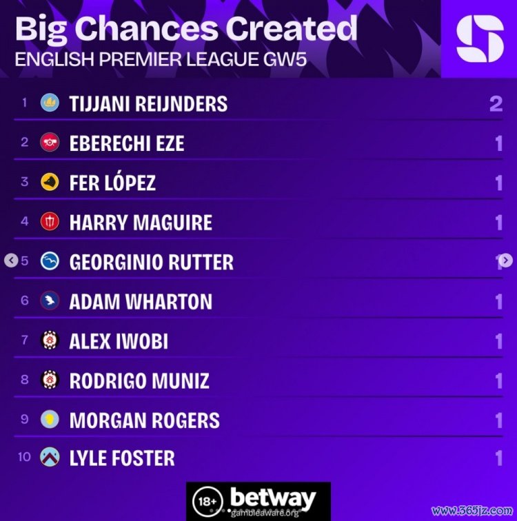 9月24日讯 英超第5轮战罢,squawkafootball列各项数据排行,搏击资讯足球直播赖因德斯共创造2次重大机会,