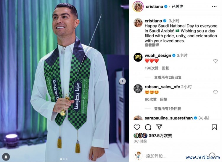 C罗社媒写道:祝沙特阿拉伯的每一位国庆节快乐!🇸🇦 祝愿你们与亲人共度一个充满自豪、团结与喜悦的节日中超直播。