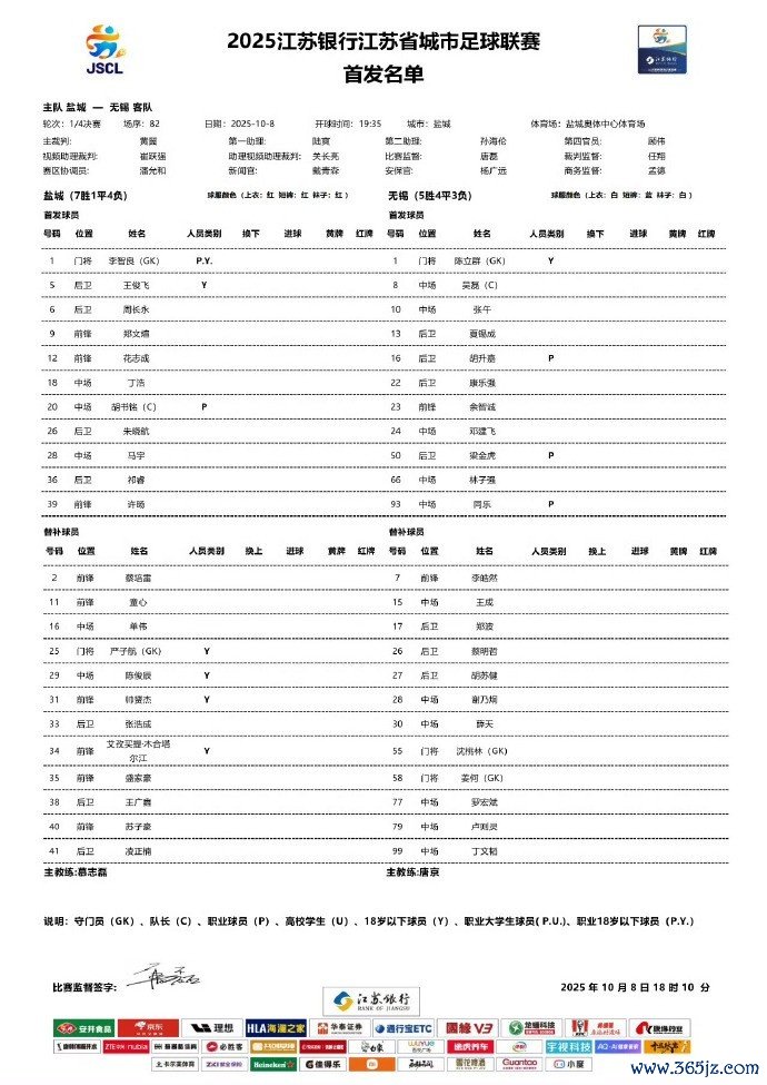 10月8日讯 10月8日晚,“苏超”出回合赛1/4总决赛 最后一场赛事 , 意甲盐城队VS无锡队。本场赛事 杆位名单出炉,搏击资讯英超直播无锡队3名职业球员杆位, 游泳快讯盐城队守门员严子航则在后备 名单内。