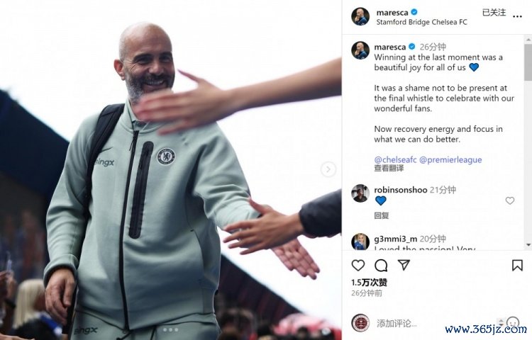 切尔西主帅马雷斯卡社媒庆祝球队取胜,他写道:“最后时刻获胜, 意甲英超直播对我们所有人来说都是一份美丽的喜悦。”