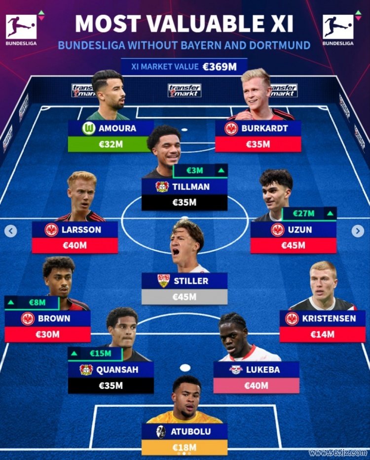 德甲除拜仁多特外身价最高阵:法鹰5人药厂2人,斯蒂勒卢克巴在列