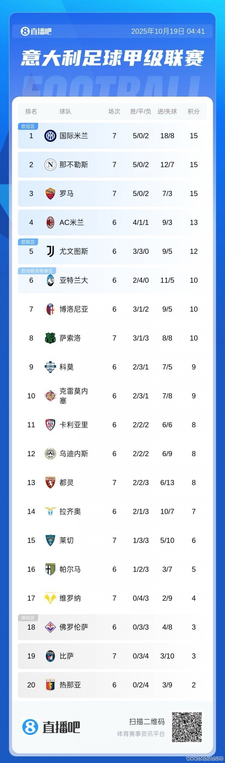 10月19日讯 本轮意甲,国米1-0击败罗马,那不勒斯0-1不敌都灵。