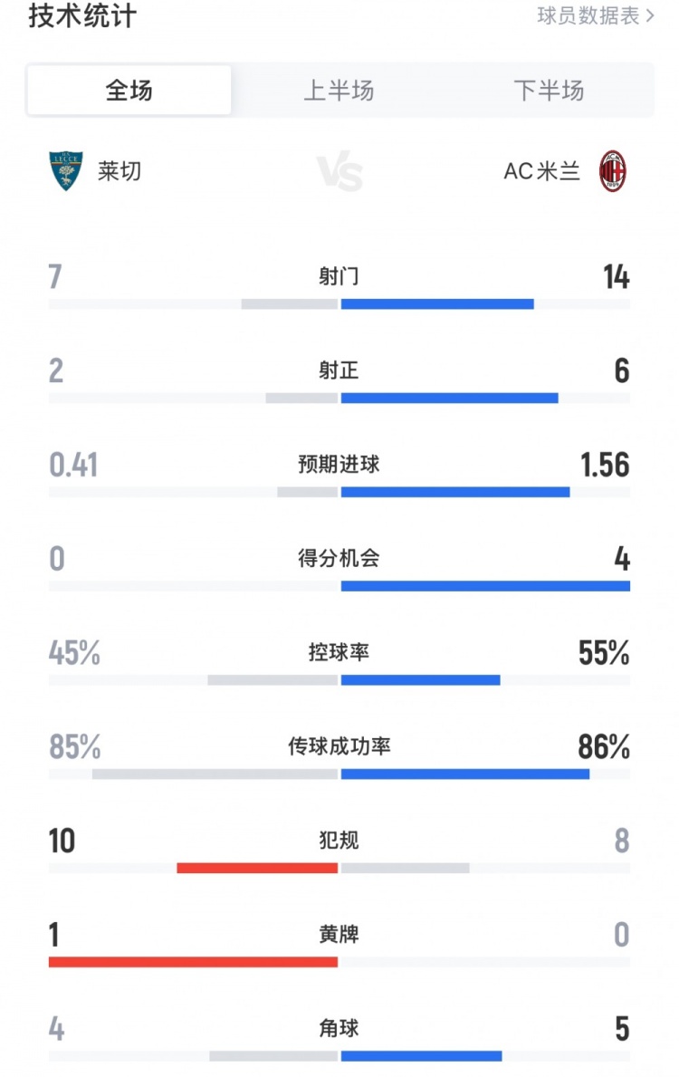 8月30日讯 意甲次轮,米兰客场应战 2-0击败莱切,搏击资讯体育直播全场赛事 数据如下(主队莱切在前):