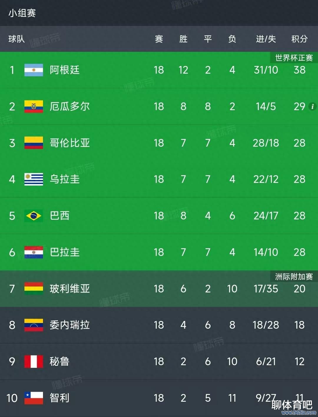 南美世预赛小组赛结束了所有赛事 , 最新积分榜如下!