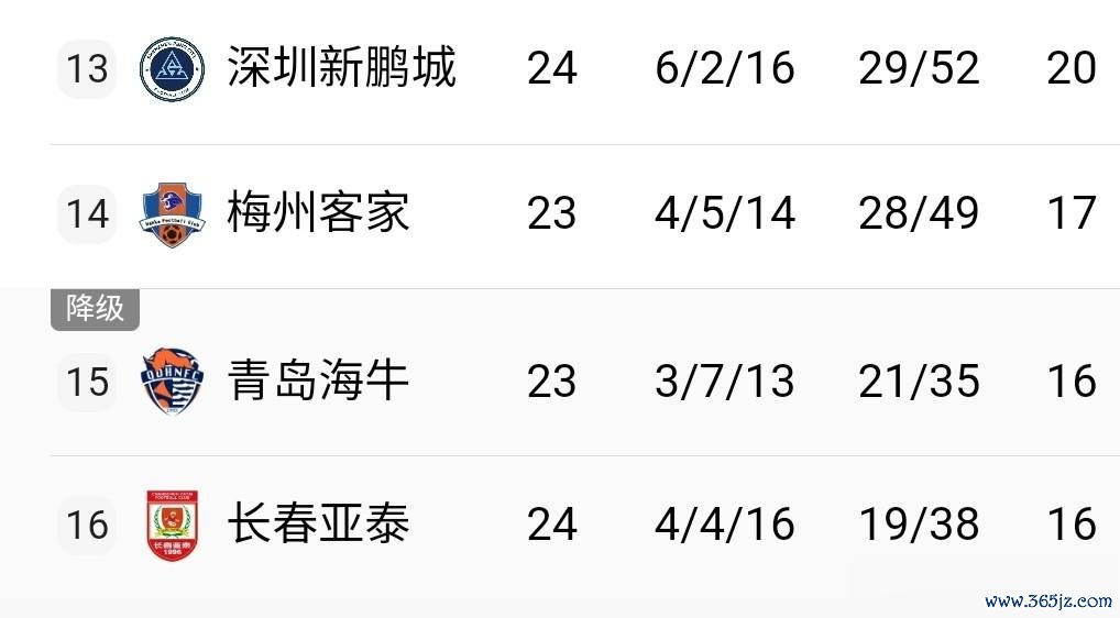 随着武汉三镇、深圳新鹏城双双落败,中超最新积分榜出炉:成都蓉城53分排名第一,上海海港51分排名第二,上海申花50分排名第三,北京国安48分排名第四。这也是本赛季第一名 的争冠热门。与争冠相比,保级更是出色 。长春亚泰积16分排名倒数第一,青岛海牛积16分排名倒数第二,梅州客家17分倒数第三,深圳新鹏城20分排名倒数第四,武汉三镇24分排名倒数第五。随着赛季接近尾声,这五队的保级大战彻底大乱。