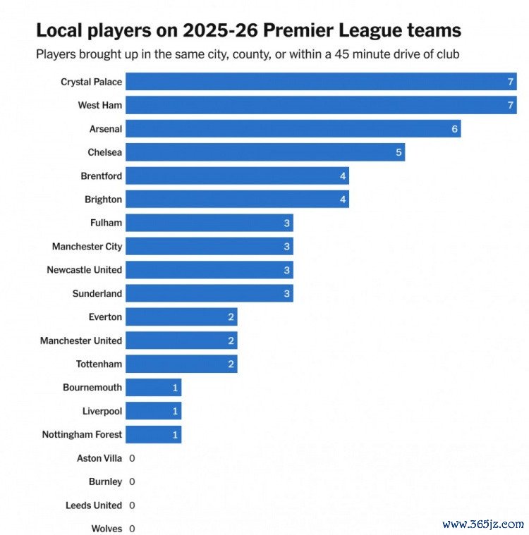 直播吧9月9日讯 日前,The Athletic统计了英超各队本地球员人数(球队所在地同城、同地区、距离俱乐部45分钟车程的本地球员)。