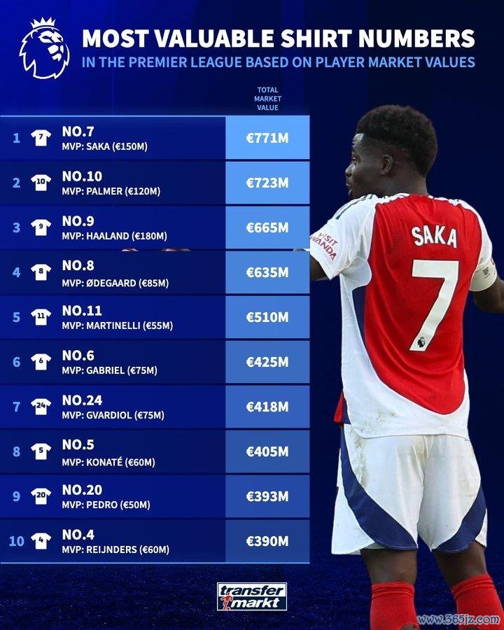 虎扑09月08日讯根据德转的数据统计 ,英超各运动活动 服 号码对应的球员总身价排行榜公布。阿森纳球星萨卡领衔的7号运动活动 服 以7.71亿欧元的总身价位居榜首。