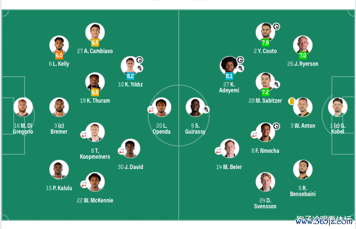 多特蒙德杆位:1-科贝尔、2-扬·库托、3-安东、5-本塞拜尼、24-斯文松、26-莱尔森、8-恩梅查(70’7-小贝林厄姆)、20-萨比策、9-吉拉西、14-拜尔(70’10-布兰特)、27-阿德耶米。