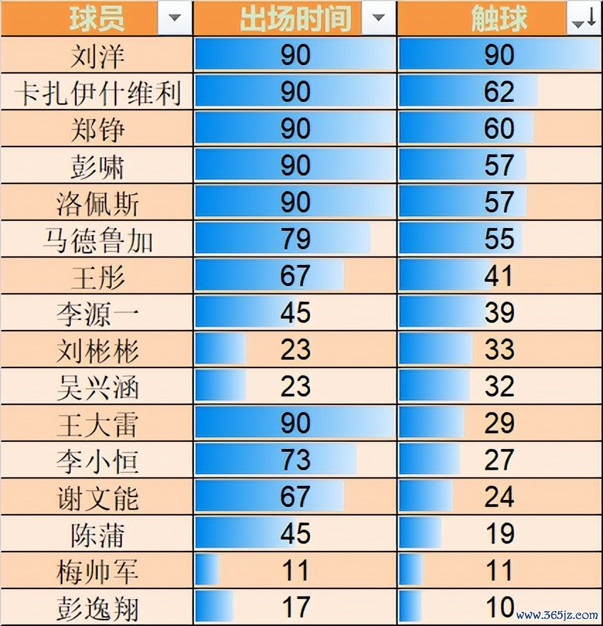 杆位球员 员中触球最少的三位分别是陈蒲的19次,谢文能的24次和李小恒的27次,三位球员都是系统型,如果能成长成瓦科那样就好了。