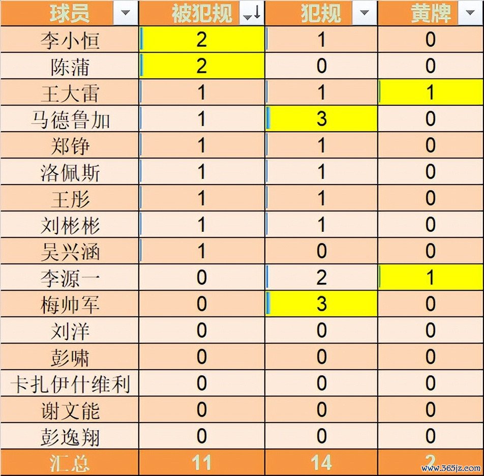 本场全队共计违例 14次,马德鲁加和梅帅军均以3次排名全队第一。