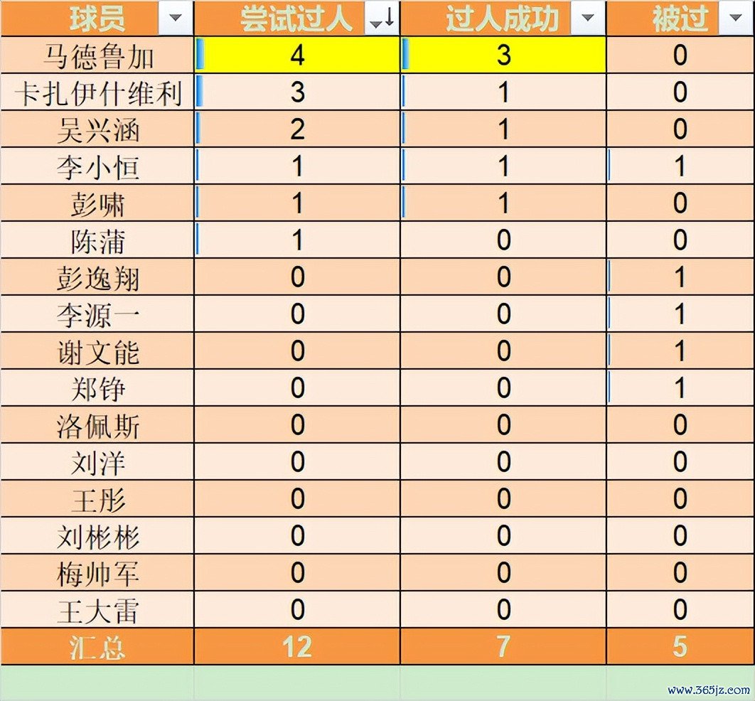 瓦科3次过人成功1次,吴兴涵2次过人成功1次。