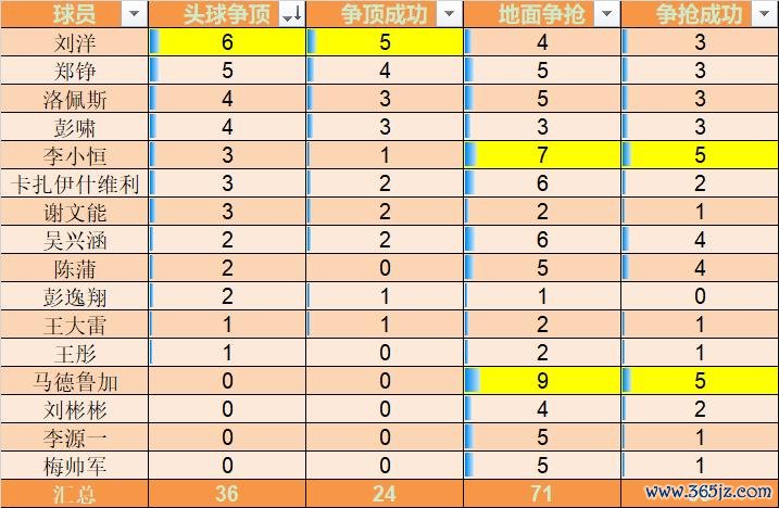 全队累计顶球争顶36次,成功了24次,成功率为67%。