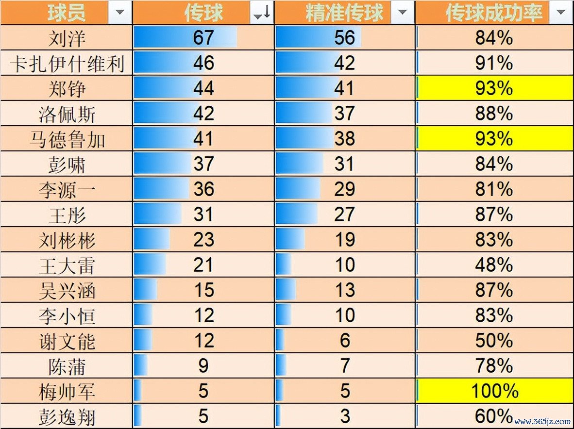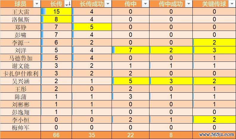 洛佩斯长传8次排名第二,成功4次,成功率一半!他那次直塞刘彬彬的球算不算长传?