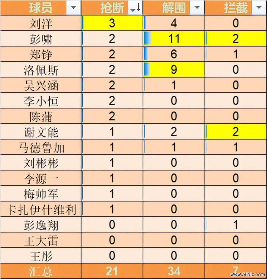 彭啸以11次解围全队第一,记忆中这应该是彭啸首次解围数上双。