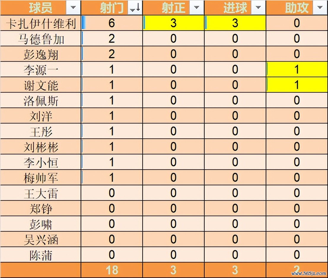 全队累计18次射球 ,其中卡扎伊什维利射球 6次排名第一。