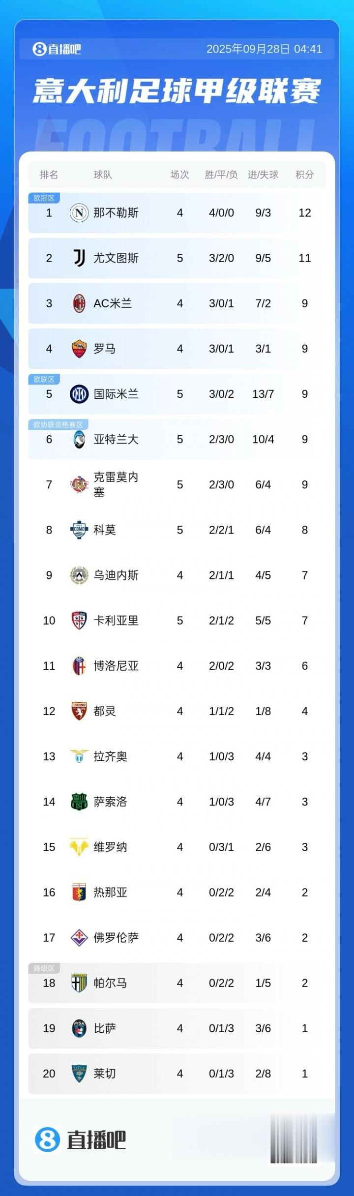 目前积分榜上,搏击资讯先赛的尤文遭遇两连平, 游泳快讯NBA直播以11分暂居第2, 意甲国米先赛以9分升至第5。